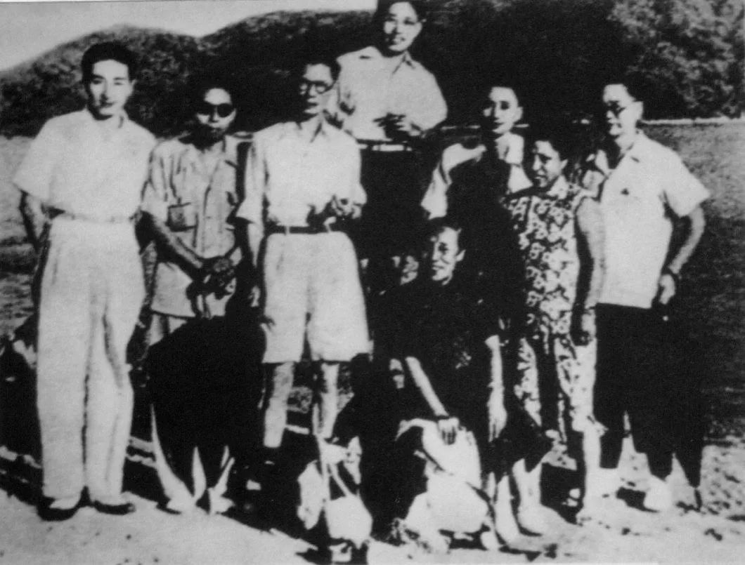 1941年,何香凝、廖梦醒与文化界人士在香港合影(左起陈歌辛、瞿白音、夏衍、丁聪、何香凝、洪遒、廖梦醒、欧阳予倩)。惠州市东江纵队纪念馆供图